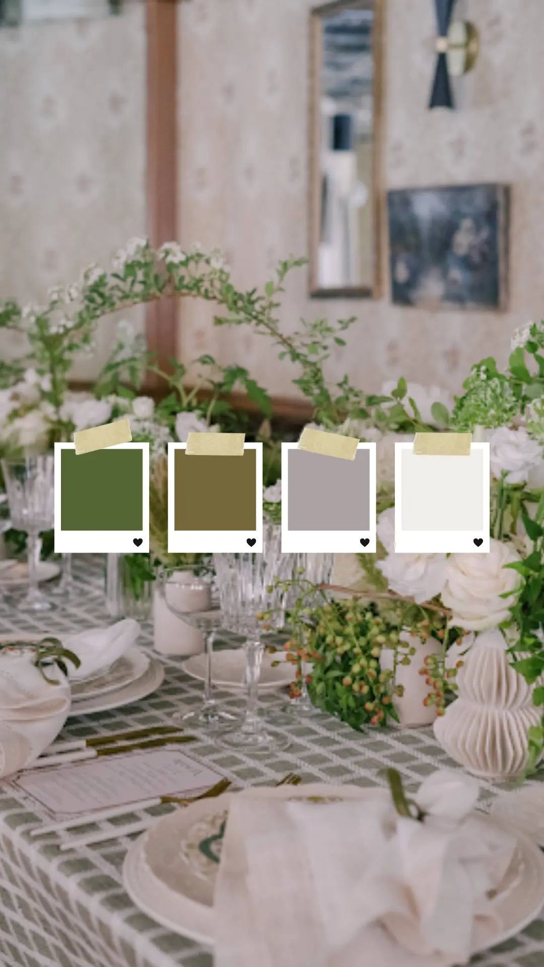 Les teintes choisies restent subtiles : sauge, eucalyptus, olive clair. Associées à Cloud Dancer, elles créent une atmosphère fraîche, équilibrée et apaisante. Cette palette fonctionne aussi bien pour un mariage en extérieur que dans un lieu baigné de lumière naturelle.