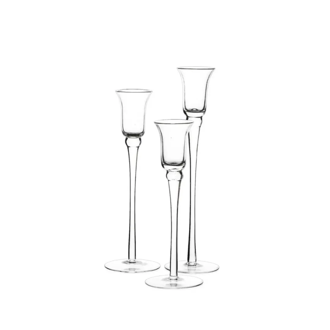 Aubert est un trio de bougeoirs en verre délicat qui joue avec la lumière et la transparence. Composé de trois hauteurs différentes (20, 24 et 26 cm), ce trio crée un rythme visuel subtil et harmonieux. Le verre transparent capte et diffuse la lumière avec douceur, apportant élégance et légèreté à votre décoration.