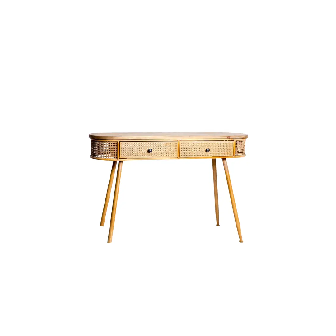 Console en cannage bois et métal avec tiroirs, idéale pour structurer un plan de table, un espace d’accueil ou une scénographie élégante lors d’un mariage en Normandie.