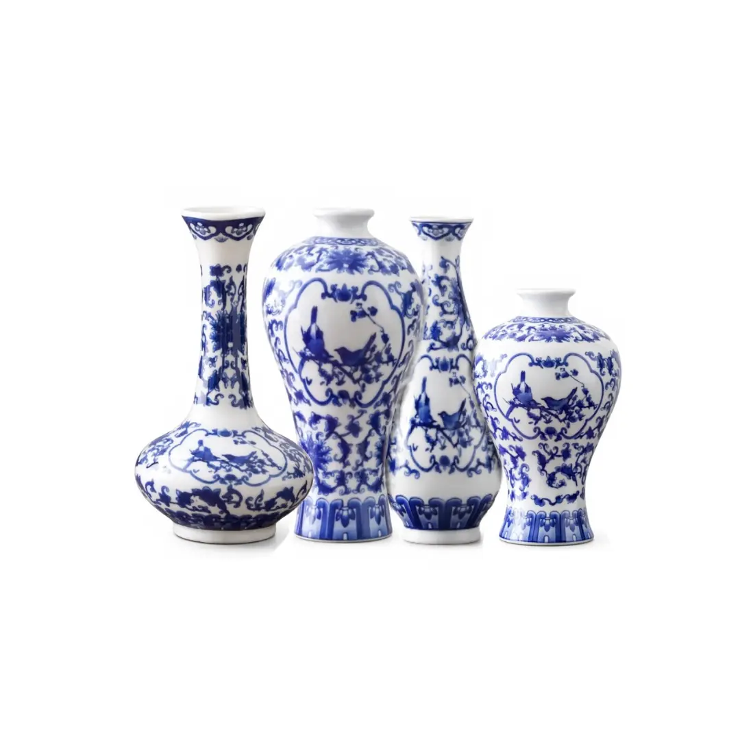 Ce lot de vases en porcelaine bleu et blanc présentent des formes variées qui apportent naturellement du rythme à la décoration. Leur motif inspiré des porcelaines traditionnelles attire le regard tout en restant subtil.