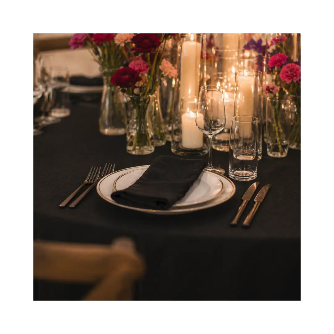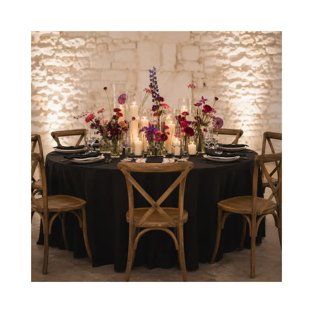 Nappe ronde noire 300 cm, idéale pour structurer une table et créer une ambiance élégante et contrastée lors d’un mariage en Normandie.
