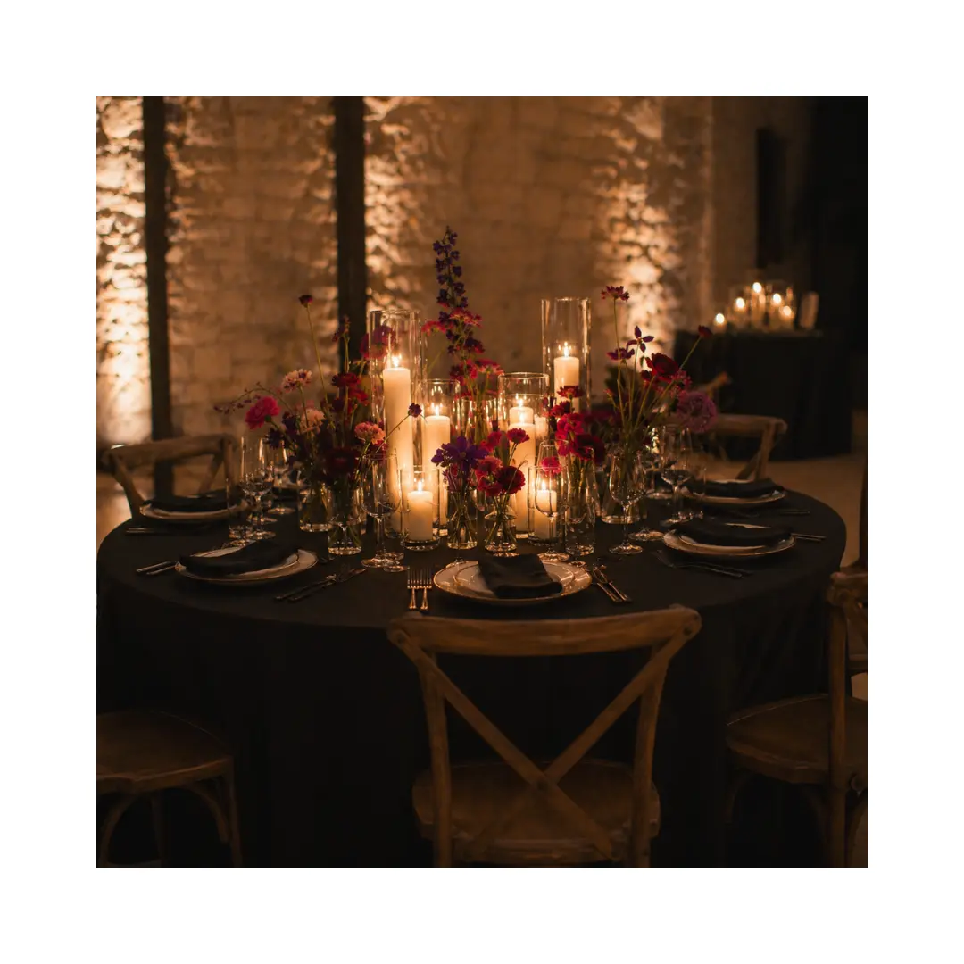 Le contraste entre le noir de la nappe, la lumière des bougies et les fleurs crée une ambiance élégante et immersive.